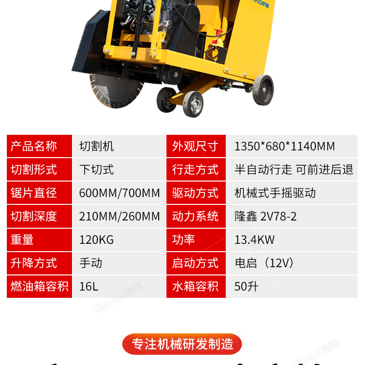 大直徑馬路切割機用于瀝青路面、水泥路面、混凝土制品、石材等的切割作業。