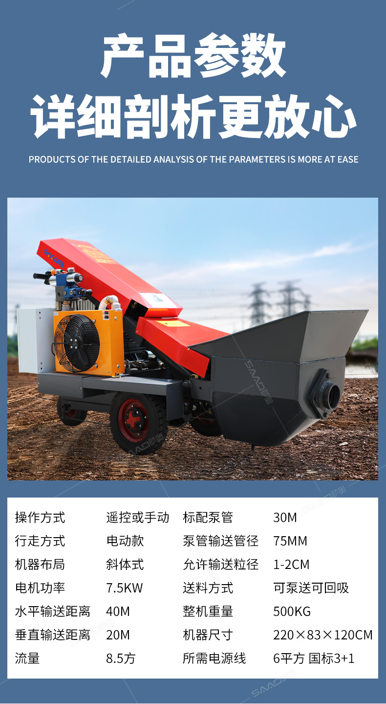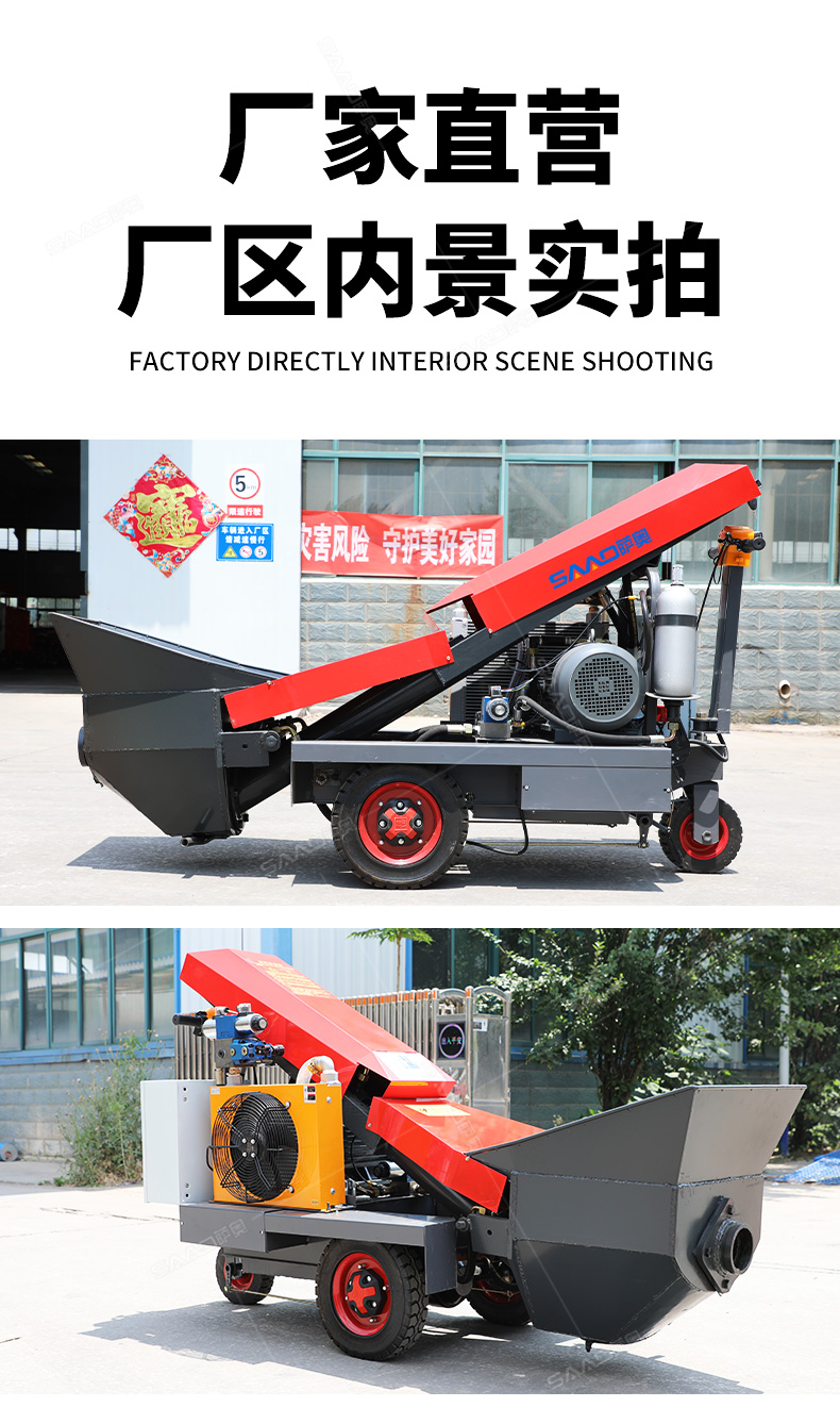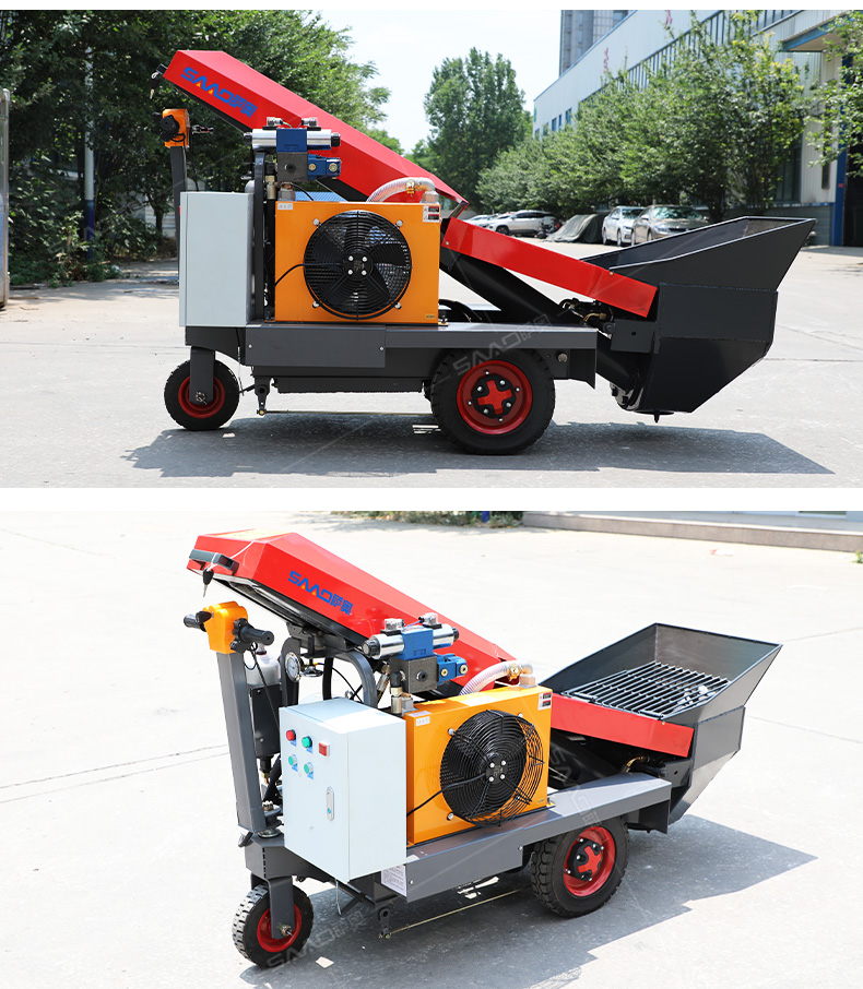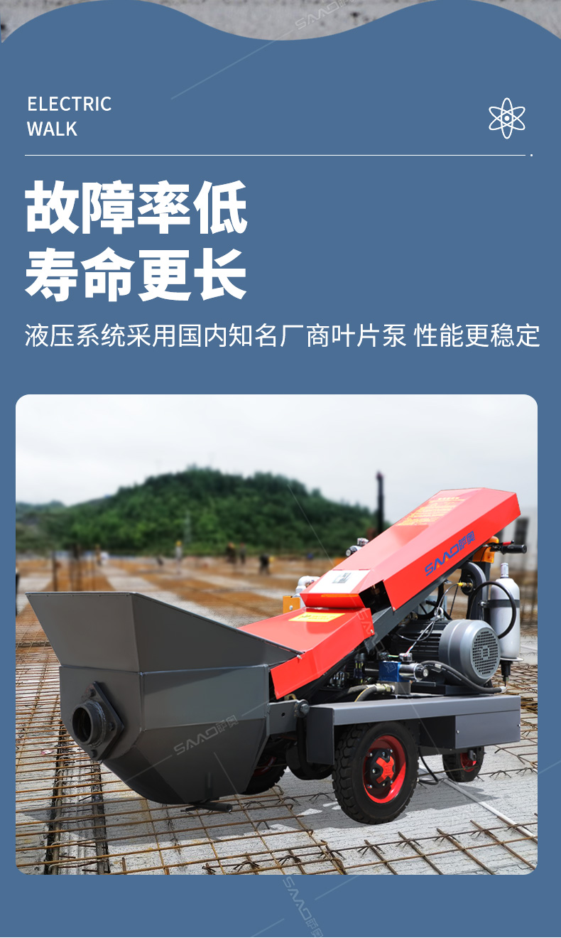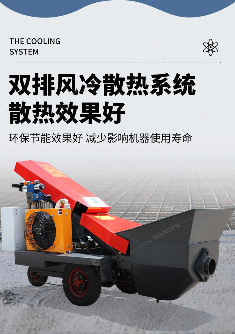 采用電動行走底盤,斜體式布局升降料斗,采用雙排風冷散熱系統(tǒng)散熱效果更好,液壓系統(tǒng)采用國內知名廠商葉片泵,故障率低,壽命更長,性能更穩(wěn)定,超長行程料缸大大提高了輸送