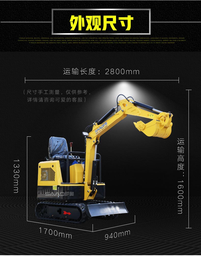該產品外觀漂亮、配置高、性能優越、油耗低、作業范圍廣.適合蔬菜大棚的土地疏松,市政部門的園林綠化、果園苗圃栽挖坑,混凝土路面破碎,砂石料攪拌,空間狹小的施工作業等,使用快換接頭,可選配旋挖鉆,破碎錘、裝載斗、抓具等各種屬具,降低維護及作業成本,解放勞動力,提高機械化程度,低投資、高回報。薩奧機械期待與您共創美好明天!