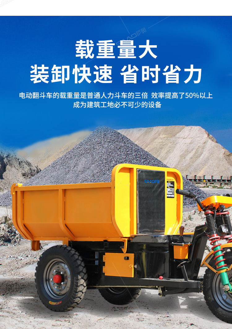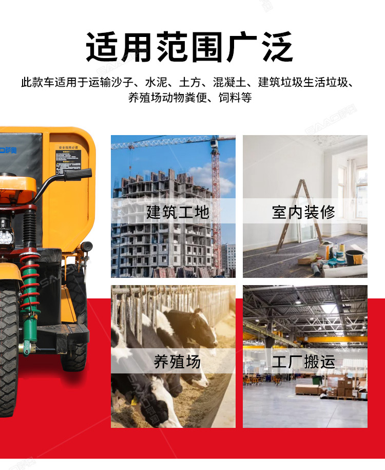 此款車適用于建筑工地、室內裝修、養殖場、工廠等場所,運輸沙子、水泥、土方、混凝土、建筑垃圾生活垃圾、養殖場動物糞便、飼料等,體積小操作簡單靈活,可原地360度轉圈,可