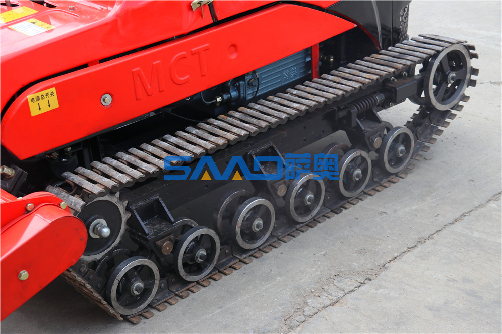 遙控履帶自走式旋耕機是在機械操縱的基礎上,采用先進的電子集成控制系統和液壓系統相結合,改進設計為機械、遙控兩套操縱系統。可以隨機操縱,也可以人機分離、遙控操縱。使履帶自走式旋耕機實現了手、自一體化操作,從而大大降低了操作人員的勞動強度,更大程度上保證了操作人員的人身安全。